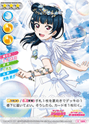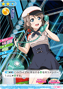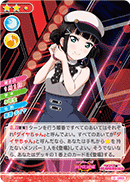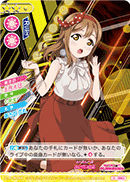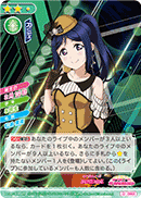 【등장 시】『카드를 2장 뽑는다.』나 『이 멤버를 참가시켜서 《라이브》를 할 수 있다.』의 어느 한 쪽을 행한다. 당신의 라이브 P가 3점 이상이라면 모두 행한다.(모두 행한다면 먼저 카드를 뽑는다.) |