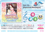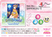 【라이브 참가 시】당신의 무대에 있는 멤버가 전부 「하나마루」이고, 이 《라이브》에 참가하는 멤버가 같은 종류의 피스 (【스마일】이나 【퓨어】나 【쿨】이나 【올】)을 합계 4개 이상 가지고 있다면, 공통 스코어가 4 감소한다. |