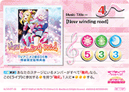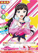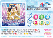 【라이브 참가 시】당신의 무대에 있는 멤버가 전부 「리코」이고, 당신의 세트 리스트에 있는 공개된 악곡 카드와 당신의 라이브 중인 악곡 카드가 합계 3장 이상 있다면, 공통 스코어가 4 감소한다. |