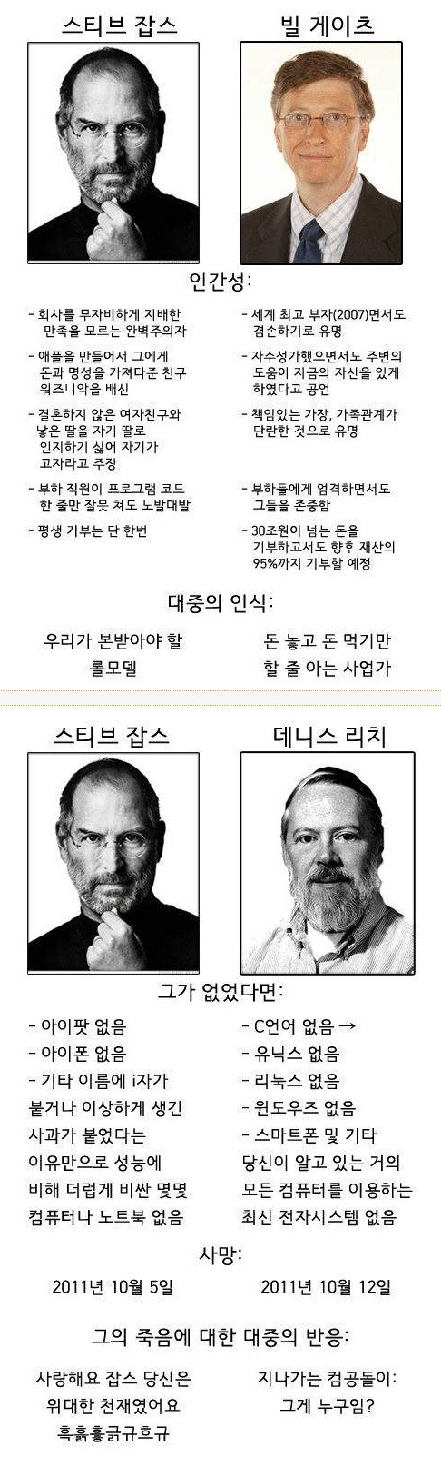 데니스 리치가 없었다면 C언어 대신 LISP같은 언어들이 사용이 되서 더 나은 세상이 됐을지도 모르죠. UNIX HATER'S HANDBOOK 같은거 읽어보면 굳이 데니스 리치, 라이누스 같은 사람이 잡스보다 훌륭한 사람이라는 생각은 안하게 될듯... 보다 많은 사람들에게 훌륭한 사용자 경험을 하게 해준 공로는 인정해야 한다고 생각해요.