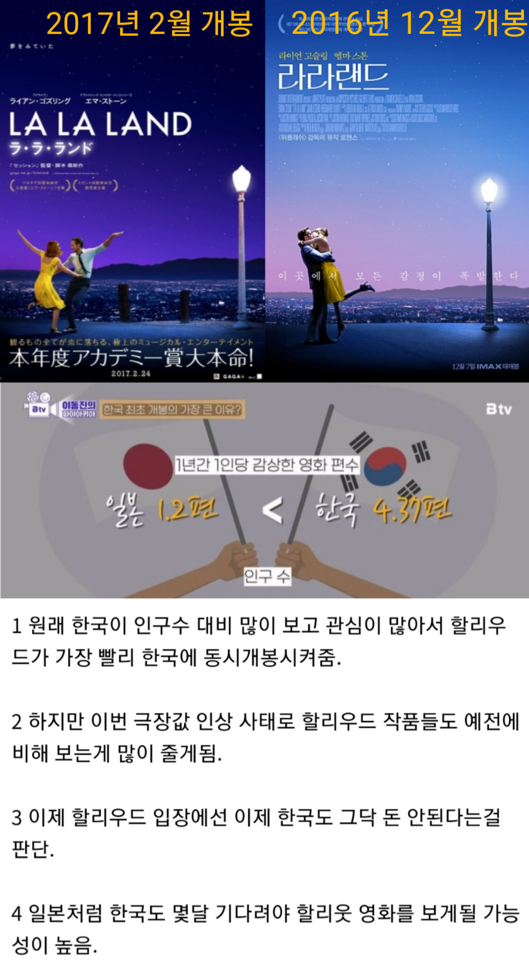 음 아직 이건 시기상조인게 (물론 이렇게 될 수도 있지만) 일단 기본적으로 외화는 수입 비용에 비해 이윤이 쉽게 나기 때문에, 아직까지는 수익이 떨어져도 손해보지 않는 장사를 할 여력은 있구요 (국내 제작자들은 지금 간당간당하죠.) 티켓 가격이 오른 덕분에 특수관에 걸리는 기대작들이었던 대형 영화들의 수익은 아직까지는 그럭저럭 나오고 있어요. 특히 앤트맨, 아바타 같은 영화들 흥행 보면 여전히 한국이 아시아 지역에서는 인구대비 굉장한 수준으로 나오고 있고, 추세가 크게 바뀌지는 않았어요. 그리고 일본하고 한국은 상황이 많이 다릅니다. 찾아보시면 일본에 외화가 늦게 걸리는 이유가 단순히 영화 보는 관객수가 적기 때문이 아닌걸 아실 수 있을 겁니다(https://m.ruliweb.com/community/board/300779/read/41002098?) 우리나라는 전반적인 분위기가 '그래도 대형 영화는 극장에서 봐줘야지' 하는 심리가 남아있기 때문에 상황을 좀 더 지켜봐야할 거 같아요.