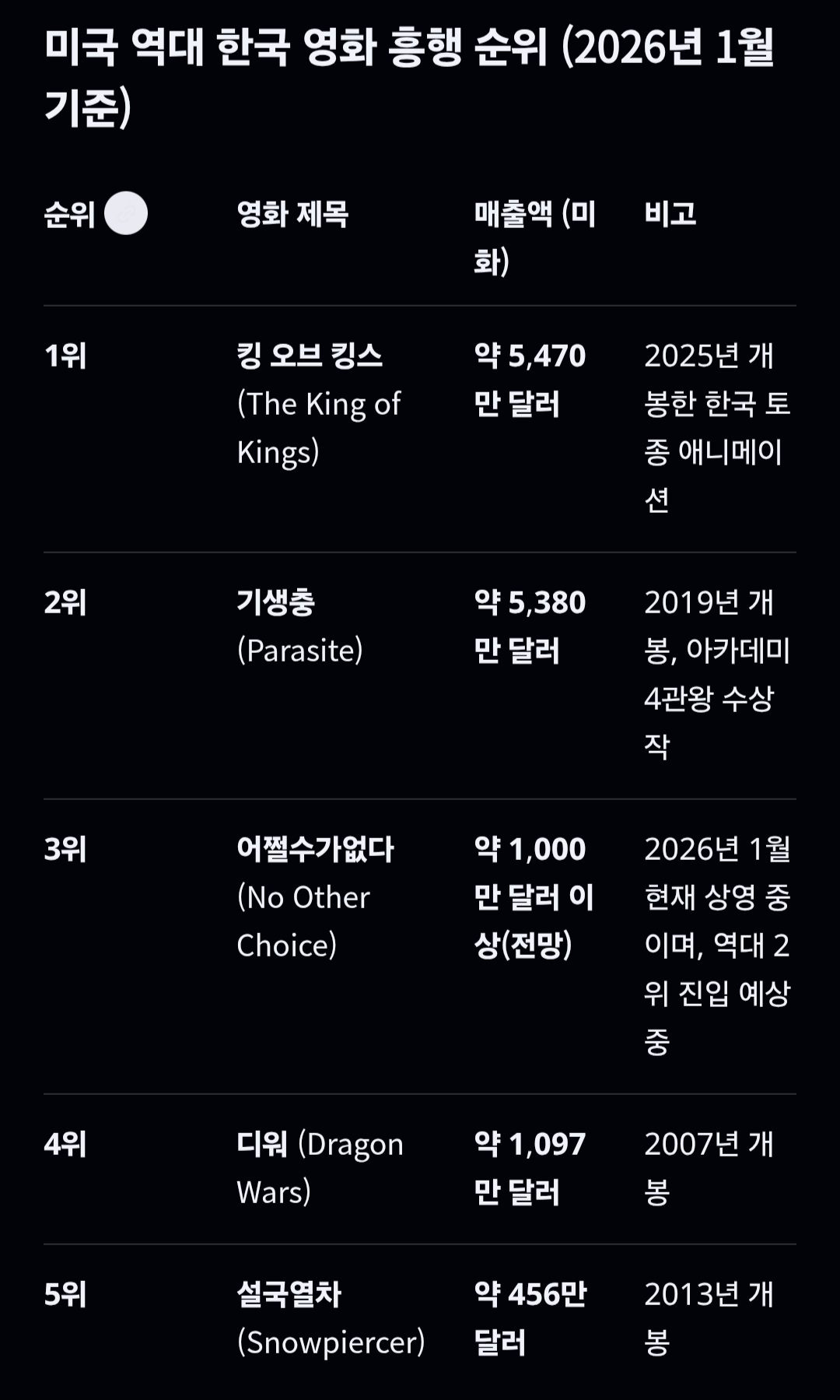 봉준호감독의 기생충에 이어 북미개봉 한국영화 역대흥행 2위에 오르것으로 예상됩니다.