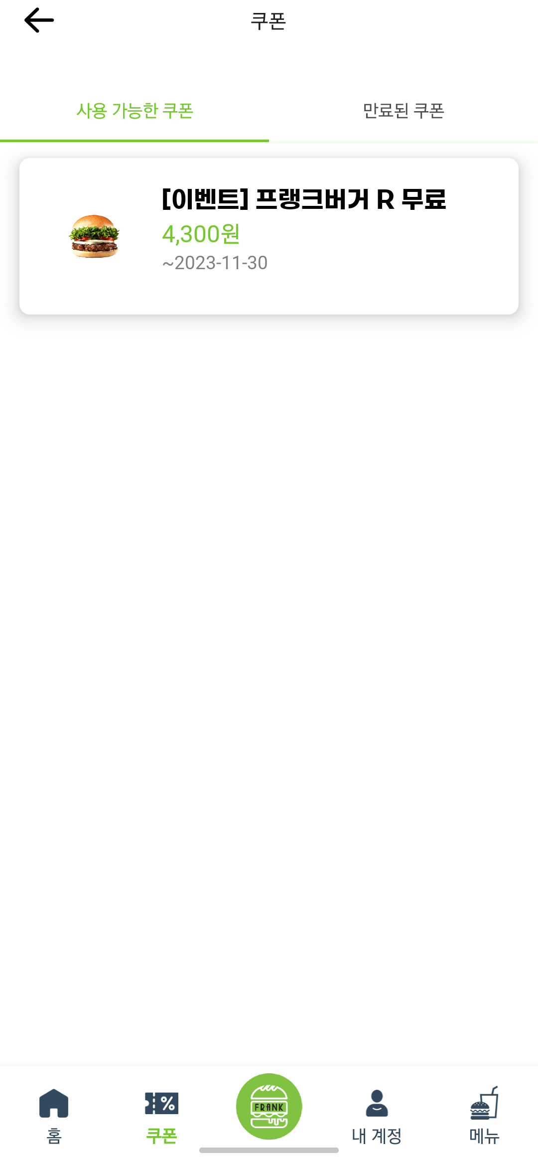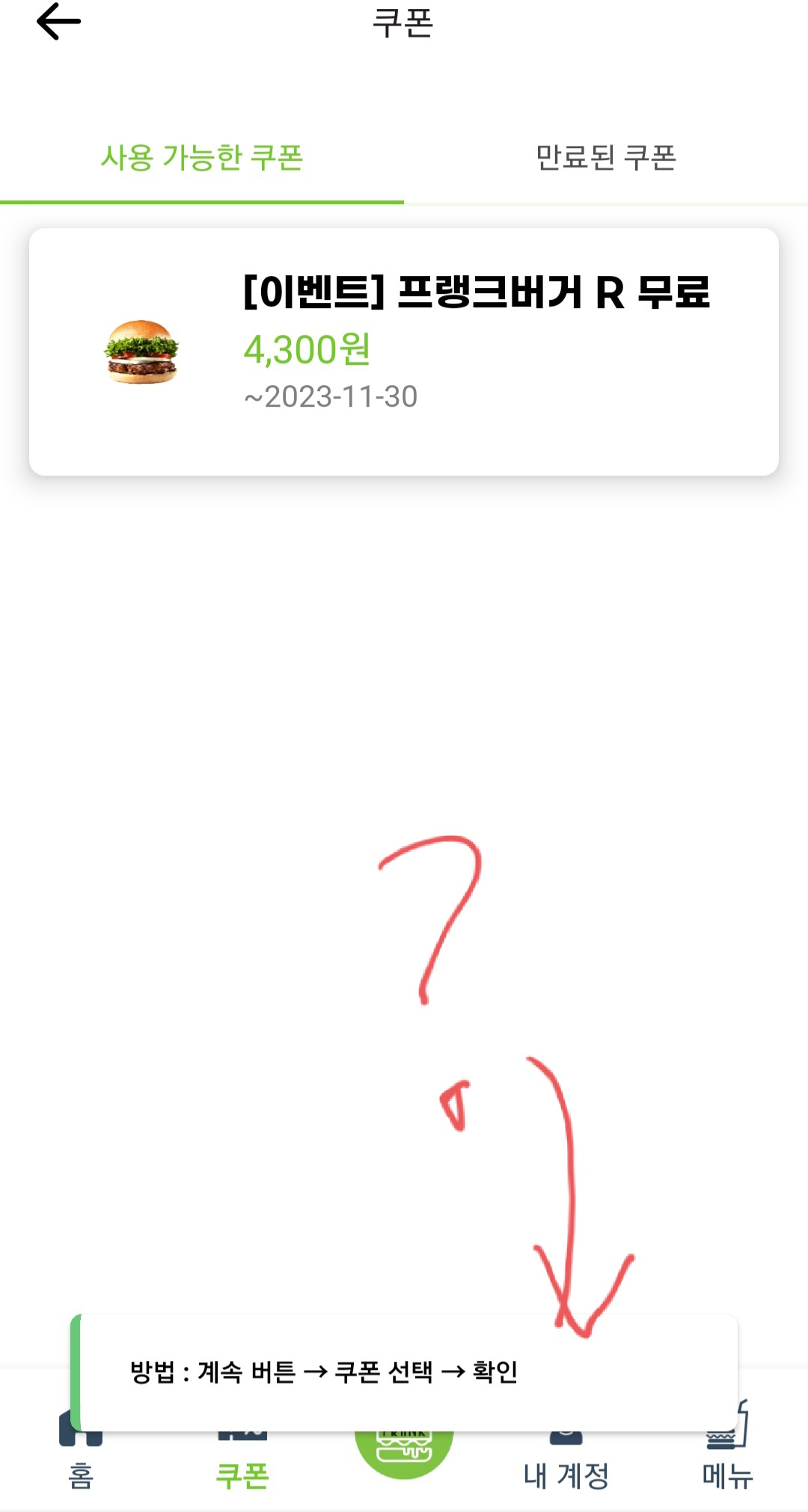 픽업으로 아무 메뉴 고른 다음 결제수단 선택할때 쿠폰 선택 메뉴가 같이 뜨는데 거기서 쿠폰 선택하면 자동으로 무료 버거 추가되는 식이네요 | 23.12.13 20:27 | | |