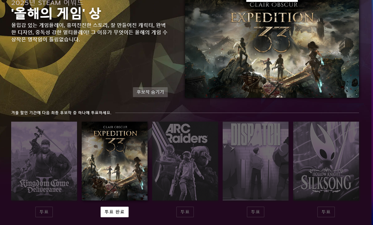 저도 AI로 사진 만들어보니 잼있더라구요 ㅎㅎ 스팀어워드에서도 올해의 게임 투표하길래 이런거 잘안하는데 전 투표했네요 ㅎㅎ | 25.12.22 11:02 | | |