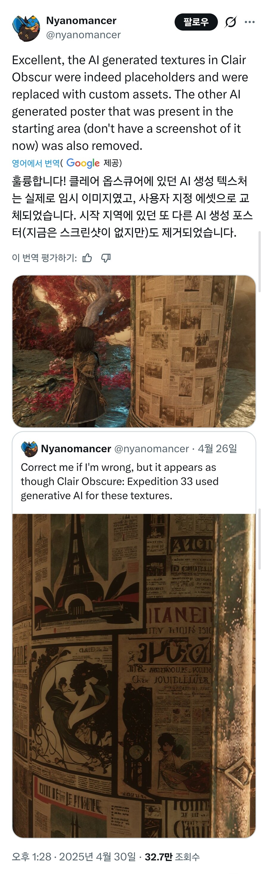 메세지 아닌 메신저 공격은 뭐다? 손바닥으로 하늘을 가려야지 이렇게 버젓히 써 놓고 우린 안 썼다고 말하는 게 웃겨서 얘기하는 건데, 뭐 인류를 구원할 갓겜이라서 모른척 해줘야됨 얘네들이 신임? AI 텍스쳐 게임 곳곳에 상용 됐고 그걸 비판하는 유저들은 생성형 이미지를 리터칭 없이 대놓고 쓸 정도면 아트 전체가 AI일 수도 있다는 의구심을 품는거임 사실 AI로 뽑고 리터칭 하면 제작자 본인 양심에 맡기는 수 밖에 없음, 확실히 AI가 대단한 건 수정한 이미지 보다 패치전 AI 이미지가 훨씬 아트적으로 휼륭해보임 ㅋㅋㅋ | 25.12.26 10:17 | | |