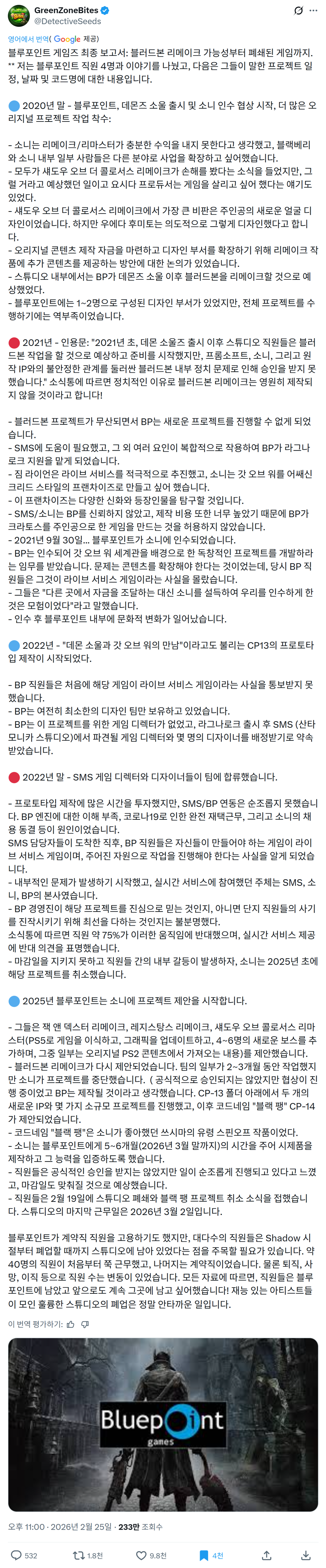 물론 이 인터뷰의 진위 여부를 독립적으로 확인할 방법은 없으므로 교차 검증 전까지는 신중하게 받아들일 필요가 있습니다. 다만, 블루포인트가 소니에 인수된 이후 겪어온 혼란스러운 행보에 대한 기존 보도들과 비교해 보면 전체적인 타임라인은 어느 정도 일치하는 것으로 보입니다.