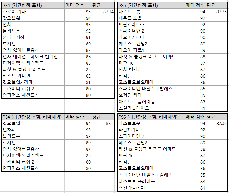 PS4 시절과 PS5 출시 후 동기간 타이틀 비교로 퍼스트파티 비중으로 보자면 PS4가 우세하긴합니다. 다만, 그걸 제외하면 PS4 동기간 시절보단 PS5 타이틀이 많긴합니다. (세컨드랑 서드 타이틀이 많음) PS4 (2013.11~2019.02) 블러드본, 그란투리스모 스포츠, 라쳇앤클랭크, 언차티드 4, 호라이즌 제로던, 갓오브워, 스파이더맨, 인퍼머스 세컨드 선, 언틸 던, 그래비티 러쉬 2, 드라이브클럽, 킬존 쉐도우폴, 라스트가디언, 디오더1886, 디트로이트: 비컴휴먼, 완다와 거상 등 => 눈에 띄는 작품 16개 PS5 (2020.11~2026.02) 그란투리스모 7, 데몬즈소울, 라쳇&클랭크: 리프트어파트, 리터널, 갓오브워 라그나로크, 호라이즌 포비든 웨스트, 스파이더맨 2, 아스트로봇, 스텔라 블레이드, 데스스트랜딩 2, 고스트오브요테이 등 => 눈에 띄는 작품 11개 소니 작품들만 찾아봤고요. 헬다이버즈2랑 콩코드는 PC랑 동시발매했으니 독점으로 일단 안봄. | 26.02.26 21:11 | | |