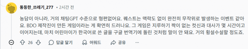 진짜 스토리텔링이 파멸적으로 괴랄함. 글 쓸줄 아는 사람한테 좀 맡겨서 개연성이라도 챙겼어야 하는데 그런거 필요 없다고 생각하는 사람이 윗선에 분명히 있음 | 26.03.20 14:56 | | |