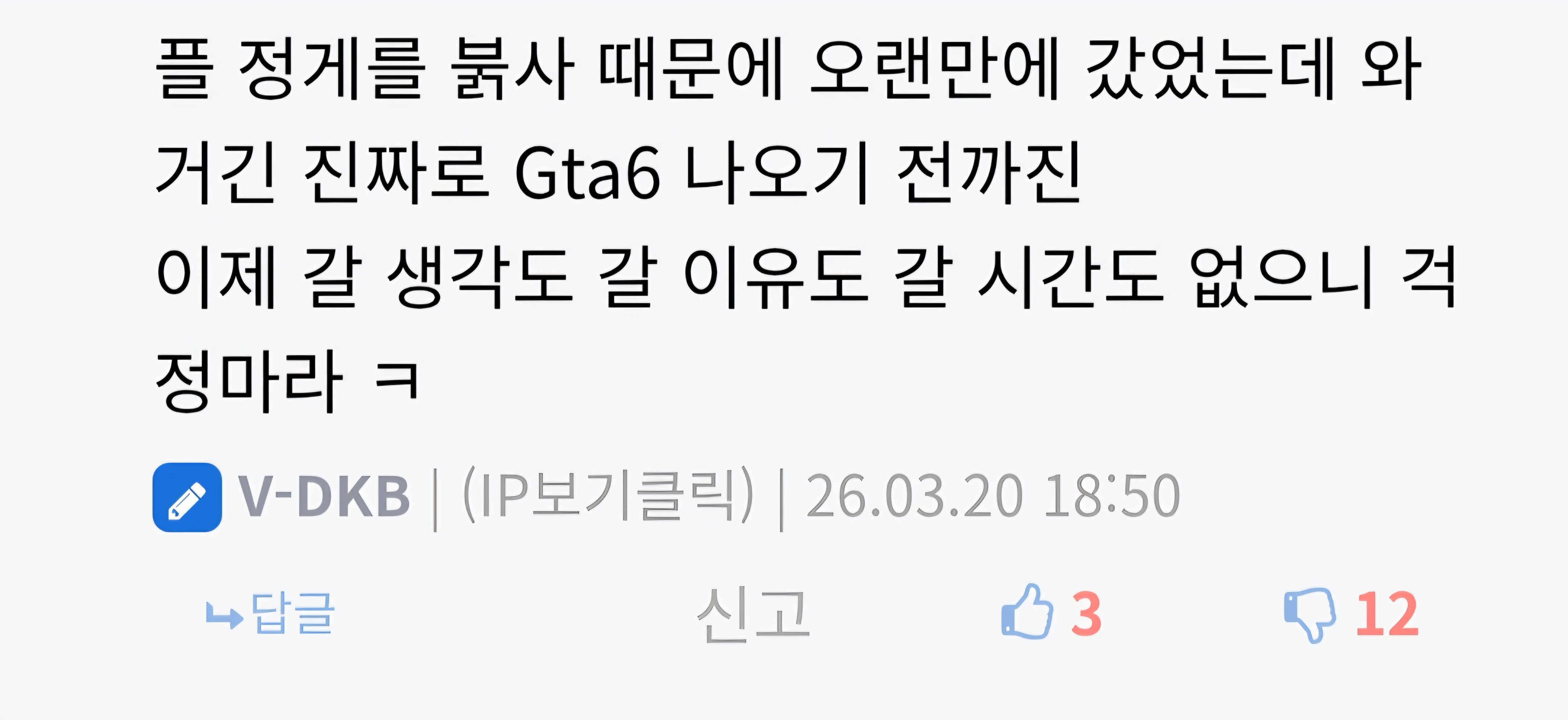 '개 못만든 게임인데 이 사람이 즐거워 하는 이유는 펄어비스 주식에 투자를 했기 때문이에요!' 라는거 반박당하고 재 반박은 못하고 잠수 타는거 개 쪽팔릴듯 ㅎ | 26.03.29 16:27 | | |