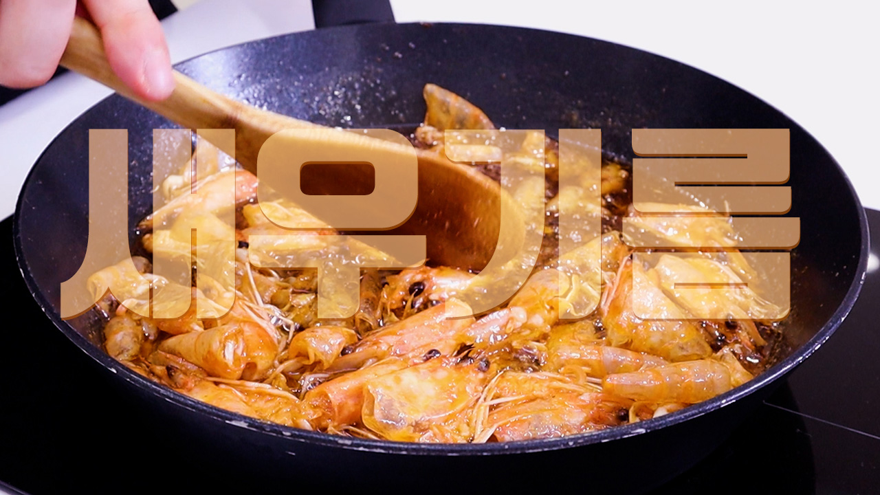 새우머리 넣고, 강불(1분)에서 볶아주세요