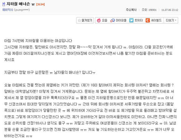 그 영화도 실화를 바탕으로 나온 거고 남자는 회사 짤리고 가족들은 자살직전까지 가고... 보통 여자들은 치한을 당하면 자신의 뒤에 있는 남자를 의심하는데 사실 진짜 치한들은 뒤에서 만지지 않고 옆에서 만지는 경우가 많음. 뒤에 있을 경우 손을 빼기가 힘들고 바로 범인이라고 의심받기 쉽기 때문. 저 사건의 범인도 옆에 있었던 남자. | 17.01.05 23:24 | | |