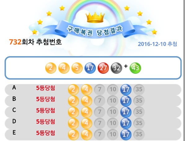 4등 5등은 고정이라 4등 5만원 5등 5천원이여 | 17.01.02 15:03 | | |