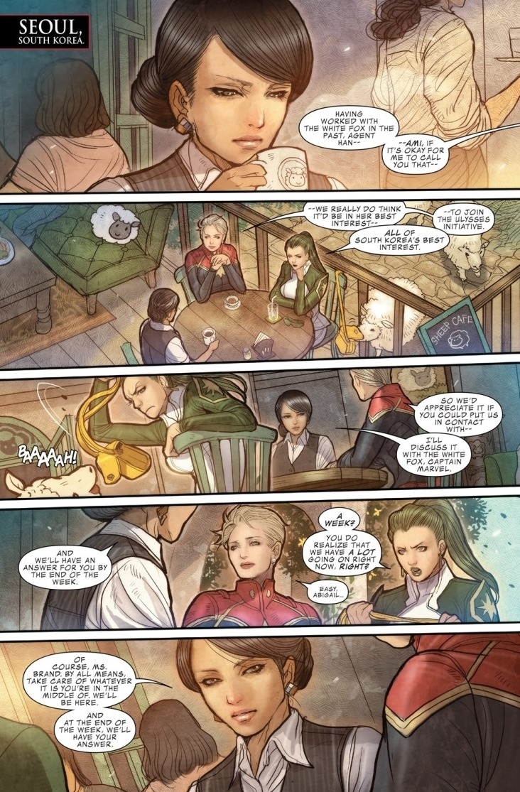 서울의 한 카페에 캡틴 마블과 아비게일 브랜드 요원이