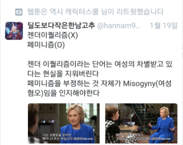 근데 젠더 이퀄리즘이란 건 Gender equality(젠더 이퀄리티)의 잘못된 표기라더라. 내가 gender equalism으로 영문검색해보니까 Gender equality로 수정된 검색결과가 나옴. https://en.m.wikipedia.org/wiki/Gender_equality | 17.01.27 20:35 | | |
