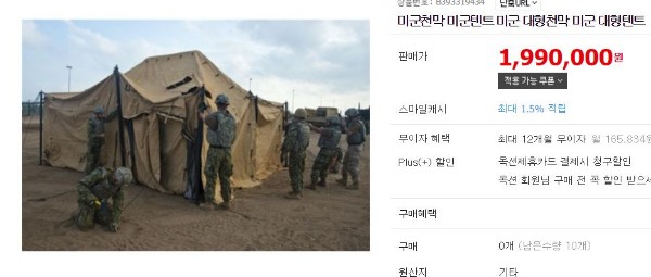 오히려 미군에서 방출되는 중고텐트 가격이 190만원이 넘는데 원래 조달가격이 190만원보다 비싸야하는거니 300만원이 넘을수 있겠다 | 17.05.14 00:22 | | |