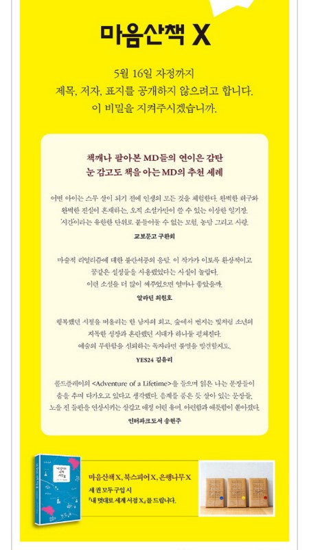 http://mobile.kyobobook.co.kr/showcase/book/KOR/9788960903111 완전 랜덤 이벤트는 끝났고 지금은 개별 책 판매 페이지로 들어가면 됨 원래 이벤은 4/1~4/26일. 5월 16일 어제자로 개별판매 밑 랜덤판매 다시 시작 그동안 자세한 내역은 http://m.blog.naver.com/maumsanchaek/220973788755 여기 참조 정확히는 오늘 자정에 책의 표지디자인도 공개되니 천천히 사시면 됩니다 | 17.05.16 17:31 | | |