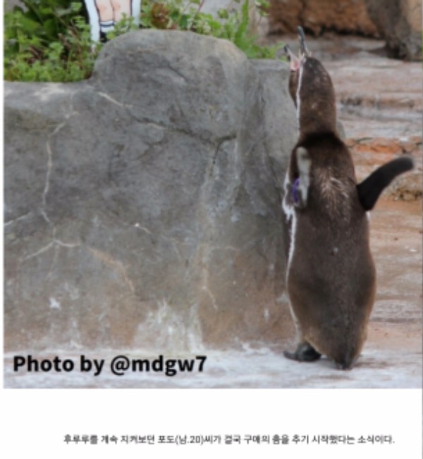 찾아가서 본건데 딱히 판넬과 사랑에 빠졌다기 보단 늙고 다른 펭귄들 사이에 왕따당해서 판넬 아래 죽치고 있는 느낌 그쪽은 펭귄들이 잘 안오더라 하루종일 판넬 처다보는것도 아니고 그냥 그 아래에 앉아있고 등돌리고 있고 밥때되면 밥달라고 사육사만 봄 사실 그레이프보다 더 재밌었던건 판넬 뒤쪽에 바윗덩이 놔둔데서 퍼질러 자다가 사육사한테 들켜서 물에 집어던져진 밥먹기도 귀찮은 말년병장 펭귄
