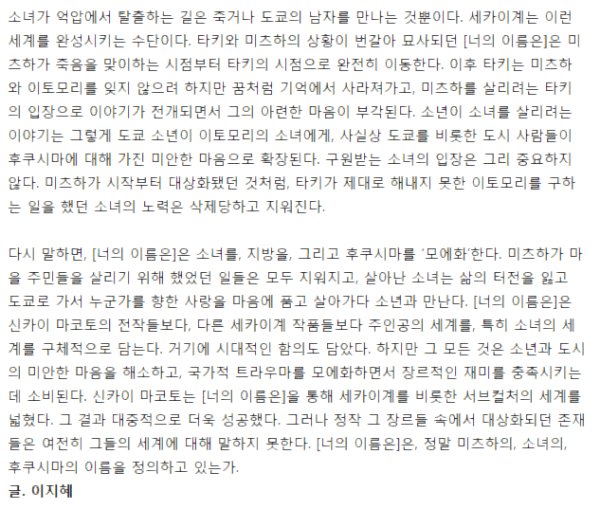 ??? 영화 본 거 맞음? 저 영화 감독이 남주에게 자기이입하는걸로 유명한 놈인데 "현실을 알아가는"??? 저 기자가 쓴 글에도 드러나있지만, 초반부 기본적인 플롯은 도쿄 남자가 자기 생활의 우월성을 지방촌년에게 보여주고 시골 생활을 개선함으로써 남자가 구원자 역할을 하는거다. 남성향 패티시는 맞는데 넌 반대로 이해하고있네. 근데 알고보면 대칭적으로 구성되어있어서 여자가 남자에게 도움주는 일도 전반부에서 동등하게 처리된다. 근데 후반부에서는? 남자를 메인으로 내세워서 남자관객들 이입시켜주는데 결정적인건 다 여자가 함. 저 주장과 반대로 남자는 고생만하고 여자가 남자에게 구원자가 되어주는 전형적인 일본 오타쿠식 남성향 패티시다. 애니들 주류가 여자들이 결정적인 역할과 힘을 갖는거거든? 문제는 '대상화'된거지 '소녀의 노력이 삭제된'게 아니다. | 17.08.06 09:10 | | |
