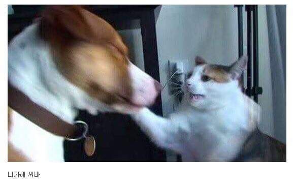 개는 코를 들이대고 고양이는 앞발로 툭툭