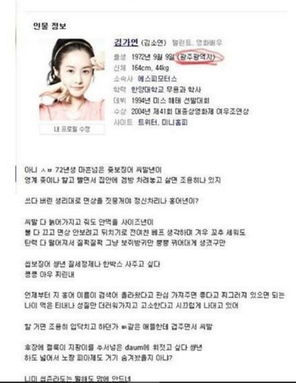 김기연이 논란이 있는건 맞는데 그게 일베 벌래새끼들이 역겨운 악플다는데 정당성을 주는건 아님 그리고 벌레새끼들이 악플단 가장 큰 이유는 김가연이 전라도 출신이기 때문 | 17.08.14 19:00 | | |