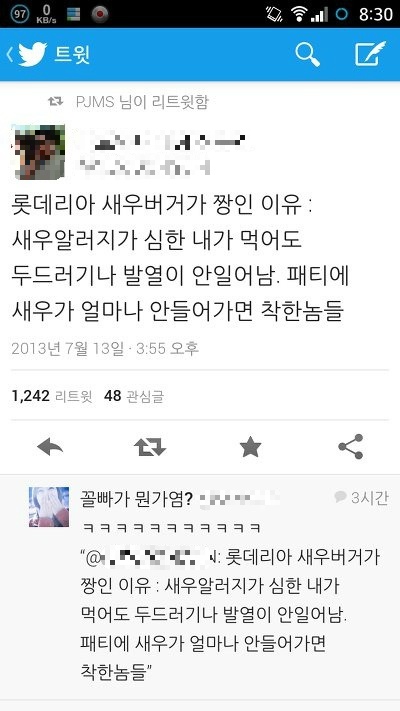 롯데리아야말로 안전의 대명사 아녀? 새우알러지 있는 사람이 새우버거 먹어도 알러지 반응 안난다며