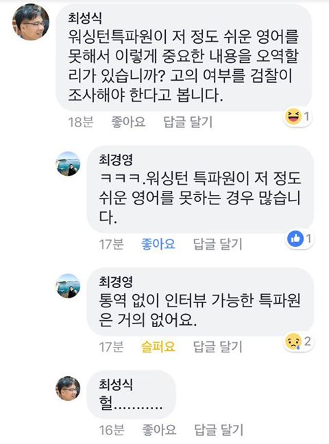 누가 이거 고의성 의심되니 검찰에 고발해야 하는거 아니냐고 하니까 언론 관계자 왈 "해외 특파원들 정말로 영어 못함" 워싱턴 가는 초 엘리트들도 통역 없으면 인터뷰 못한다네 ㅋㅋㅋㅋㅋㅋㅋㅋㅋㅋㅋㅋㅋㅋㅋㅋㅋㅋㅋㅋㅋㅋ