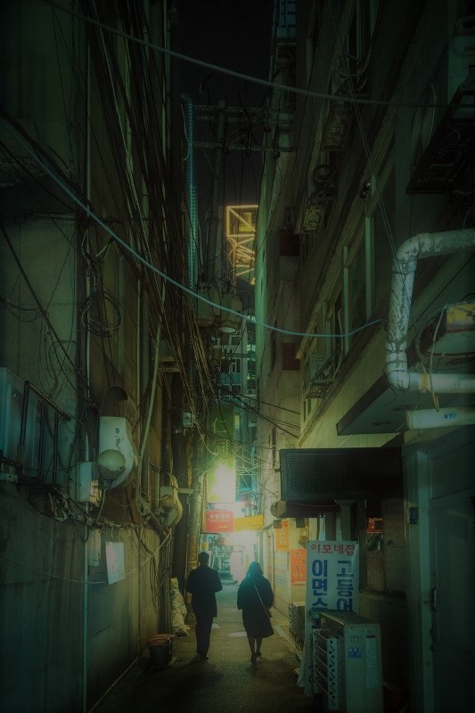 홍대 클럽 근처라면 더욱더 사이버펑크 분위기에 맞겠네 ㅁㅇ이나 알콜에 쩔은 사람들 시끄럽고 뚱땅 거리는 음악. 폭력. 이상한 패션의 사람들, 험악한 사람들 흐아
