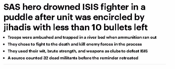 http://www.dailymail.co.uk/news/article-4658438/SAS-hero-drowned-ISIS-fighter-puddle.html 시리아에 파견된 SAS 부대원 일부가 이번에 거둔 전과다. 부대원들이 작전을 마치고 기지로 돌아오던 중 강 어귀에 잠복해 있던 isis 무장 테러리스트 50여명과 마주쳤다. SAS대원들은 작전을 수행하고 돌아가던 터라 총탄이 거의 남아 있지 않았다. 결국 대원들은 백병전을 벌이기로 결심하고 적진을 향해 돌격했다. 총으로 때리고, 돌로 후려치고, 강에다 익사시키는 등 온갖 수단을 다해 싸운 결과, 4시간 뒤 isis 테러리스트 32명을 살해했다. 남은 테러리스트들은 전원 도망쳤고, SAS 대원들은 걸어서 기지로 복귀했다. 개드립 - 영국 | 17.09.26 15:01 | | |