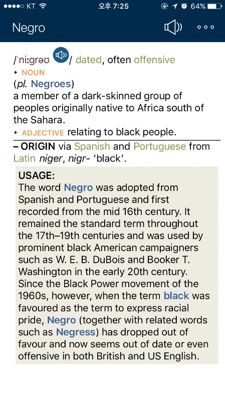 니그로라는 단어 자체는 인종차별의 공식화에서 나온게 아님 노예제폐지 운동가들부터 인권운동가들도 니그로란 단어를 씀 킹 목사의 "나에게는 꿈이 있습니다" 연설에서도 쓰임 | 17.09.30 15:53 | | |