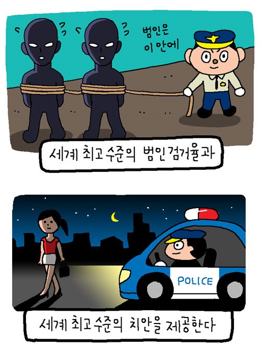 이 나라의 치안이 좋은 이유가 경찰이 열심히 해서가 아니죠. 작은 땅에 높은 인구밀도. 총기가 없는것도 한 몫 할꺼고. 최근 들어서 CCTV나 블박도 한몫할껍니다. 글구 제일 높은 이유는 밤에도 일하는 사람이 많아서 24시간 사람들이 깨어있기때문에 그런게 제일 크다 봅니다. | 17.10.27 13:26 | | |