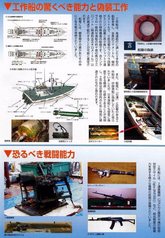 이거는 2001년 일본 해상보안청 순시선에 발각되어 교전을 벌이다 자폭한 북한공작모선이랑 모선에 있던 각종 총기랑 중화기들.