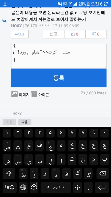 그걸 아는 놈이 이딴 개드립을 쳐? aqir 한자라서 ㅈ같아서 프로그래밍 못하겠다 그럼 한국어랑 같다는 아랍어로는? انت مين() { ستد :: كوت << "هيلو وورد!"؛ } 'ant myn() { satid :: kut << "hilu wawarda!"; } 휴 역시 표의문자인 한자보다 낫구나 ㅎㅎ 답글 | 17.11.09 06:29 | | 0 | 2 야. 니가 지금 내가 한 말을 이미 알고있었으면서 이딴 소리를 한거면 다 알면서 일부러 어그로를 끌었다고 자백한거고, 아니면 쓸데없이 존심 지키려고 이러지 말고 그냥 몰랐다고 솔직히 말하고 상황 정리하는게 나을거야. | 17.11.09 06:40 | | |