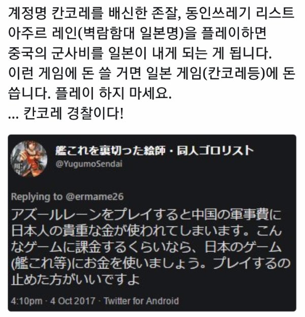 그리고 역사적으로 자국배 털었으니까 싫어해야한다는 논리야말로 칸코레경찰이랑 동급의 씹미개한 논리인거같은데 | 17.11.12 16:52 | | |