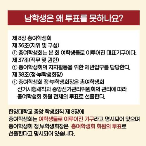 1. 이 논리에 의하면, 총여학생회는 총학생회의 하부 기관이나 독립 기관이 아니라, 총학생회의 지원을 받는 일종의 '동아리'라는 결론이군. 협회 규정에는 '본 회 여학생들'과 '총여학생회 회원'이라고 지칭했지 한양대학교 여학생이라고 하진 않았다. 2. 그렇다면 만약에 총여학생회가 총여학생회의 대표권을 주장한다면 인정해야겠지만, 교내 모든 여학생들에게 대표권을 주장한다면 각하해야 한다. 3. 그 대신에 총여학생회가 무언가 활동을 하는데 총학생회의 지원을 받을 수 있는 명분은 획득한다. 그러나 또한 대신에 총여학생회는 그 권위를 인정해 준 총학생회의 간섭과 감시와 견제를 받아야 할 의무가 생긴다. 4. 또한 이 논리대로라면 마찬가지로 동아리같은 지위의 총남학생회를 설립해서 남성권익을 위해서 총학생회의 지원을 받아내도 전혀 태클 걸 수 없다. 남성의 편의가 필요하다는 것을 총학생회에게 설득할 수만 있다면 말이다. 이렇게 되겠군. | 17.11.23 02:31 | | |