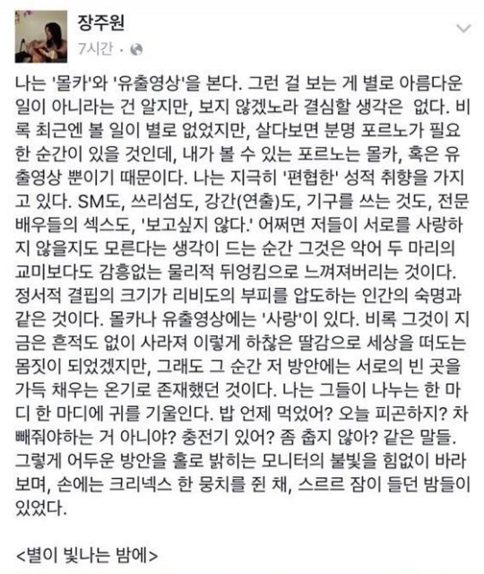 유출이나 몰카를 봐야 한다는 것에는 동의 할 수 없지만 사랑이 없는 성행위가 얼마나 덧없는 건지에 대해서는 이해가 갑니다 결국에는 성인물은 볼게 없다고 저는 이해 하겠습니다 | 17.11.29 22:47 | | |