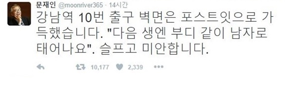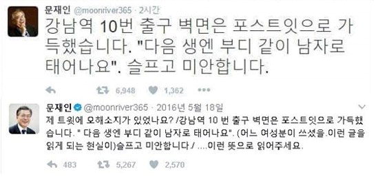 죽은 사람에 대한 슬픔하고 이름 모를 여자가 저 포스트잇을 붙인 상황이 슬프다는 것하곤 큰 차이가 있지. 후자가 슬프다고 분명히 명시했고, 결국 그 포스트잇의 내용에 공감한다는 뜻인데 별로 맘에 드는 태도는 아니다 | 17.11.29 15:22 | | |