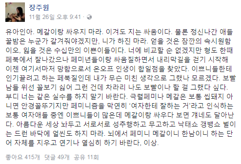 잘못하면 단체로 숲속친구들 각이라서 새치기좀 할게ㅠㅠ 맨밑에 관련 페북글 올렸는데 이 사람은 좀 걸러야 할 사람인것같음... 몰카랑 리벤지ㅍㄹㄴ 옹호한 사람이야 | 17.11.28 22:26 | | |