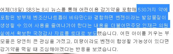 몸에 들어가는 15~20분 내에 비타민c랑 감기약이랑 화학작용해서 발암물질이 만들어질 수 없다죠. | 17.11.29 19:03 | | |