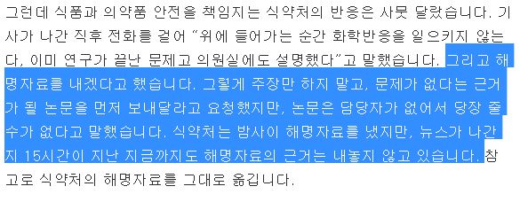 국정감사 VS 식약처.... 요근래의 식약처의 행보를 보면 그닥 신뢰가 안감. 식약처가 저거 내자마자 좋다고 조선일보는 바로 그대로 적어서 기사냄. | 17.11.29 19:43 | | |