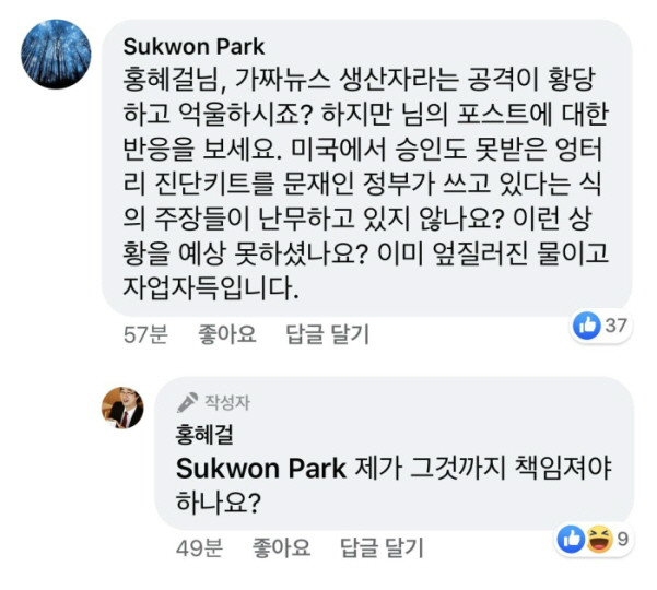 가짜뉴스를 유머있게 넘어가라고 하다니. 자신에 대한 가짜뉴스로 자신의 인생이 망가져도 그런 소리가 나올건지 의문이군요. | 20.03.17 07:14 | | |