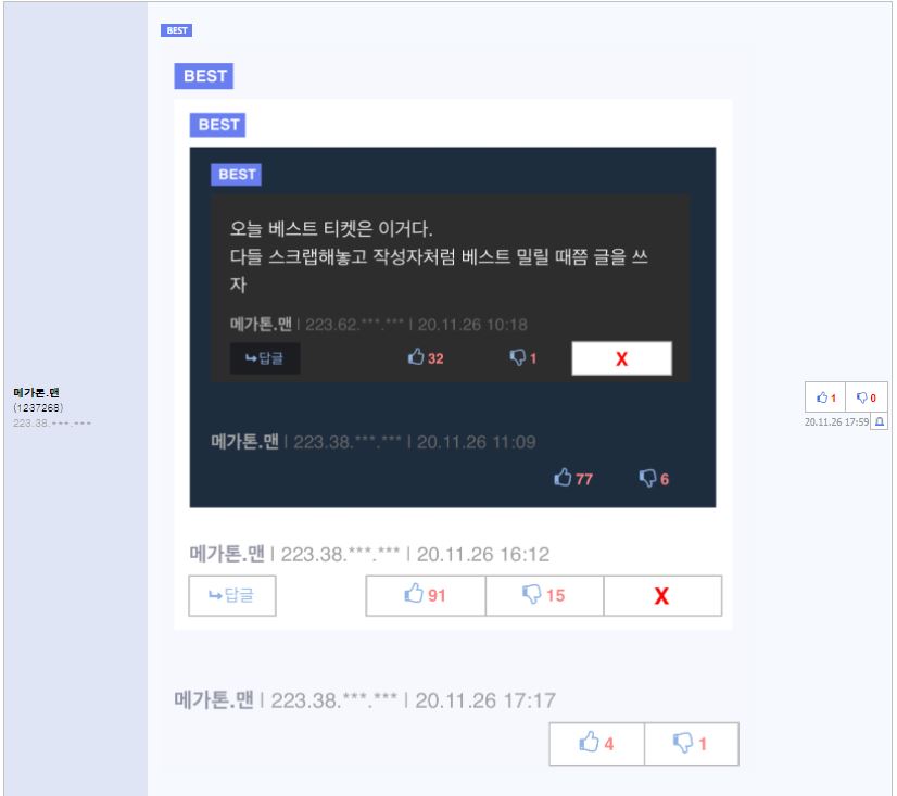생각해보니까 개꼽네 ㅋㅋㅋㅋㅋㅋㅋㅋㅋ 걍 자랑이잖아 ㅅㅂ | 20.12.01 00:00 | | |