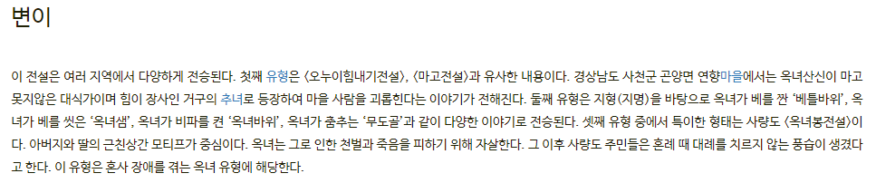 변이 셋째 유형 중에서 특이한 형태는 사량도 <옥녀봉전설>이다. 아버지와 딸의 근친상간 모티프가 중심이다. 옥녀는 그로 인한 천벌과 죽음을 피하기 위해 자살한다. 그 이후 사량도 주민들은 혼례 때 대례를 치르지 않는 풍습이 생겼다고 한다. 이 유형은 혼사 장애를 겪는 옥녀 유형에 해당한다. | 21.05.23 16:33 | | |