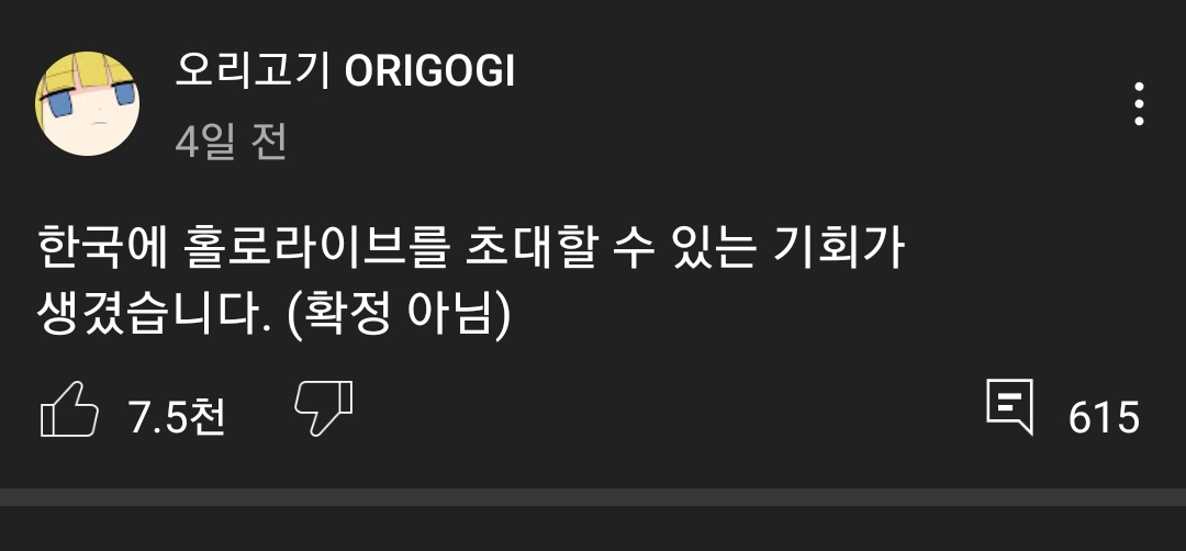 오리고기가 커뮤글써서 어쩌면 버튜버분들중 누군가를 한국에서 뵐 수 있을지도 모른다는 말을 한것같은 기분이 드는 것 같은 느낌임. 내 머릿속에서 손상된 메모리니까 찾아가서 유튜브 커뮤글 보면 될듯 | 22.04.26 10:36 | | |