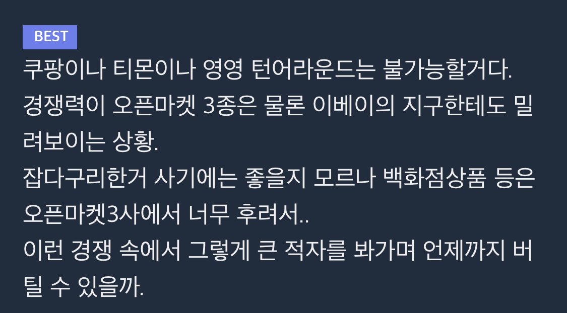 쿠팡 목적이 애초에 시장 장악임 넘버원되는 거야 구독 경제 그 후에 어떻게 변하는지는 보면... | 23.05.10 08:07 | | |