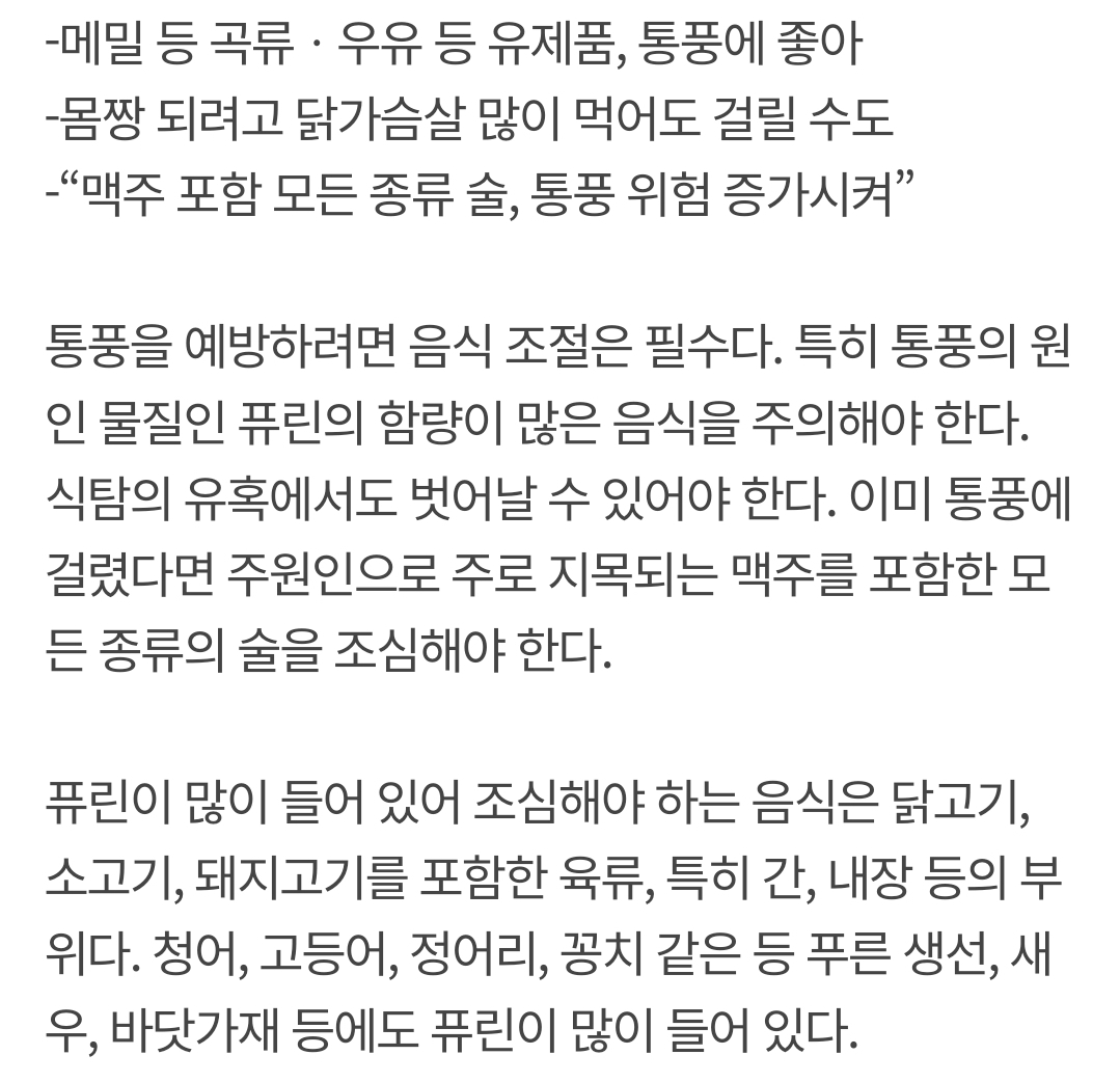 야채도 골라먹어야되고 그냥 건강한 음식이라고 다 통풍오케이 인것도 아님 아주 이 부분이 돌아버림...보통 몸에 좋다는거만 먹으면 되는데 통풍은 몸에 좋냐 아니냐가 아니라 퓨린이 얼마나 들어있냐가 문제라
