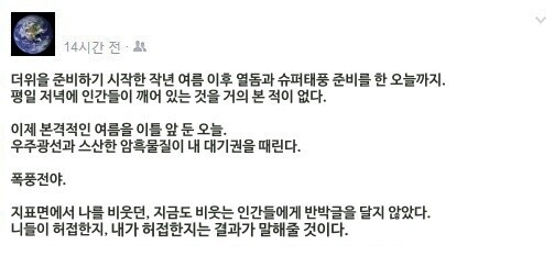 그래서 에전에 지구온난화 단어를 쓴거는 좋은 선택이 아니었다 라고 말하는 경우도 있죠. | 23.07.22 11:44 | | |