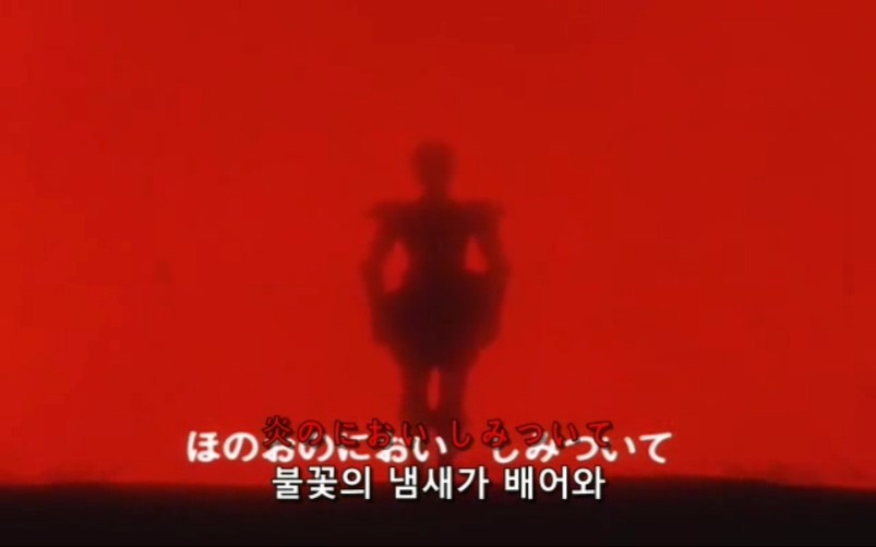 불타는 배경으로 그림자만 보이며 천천히 걸어나오기
