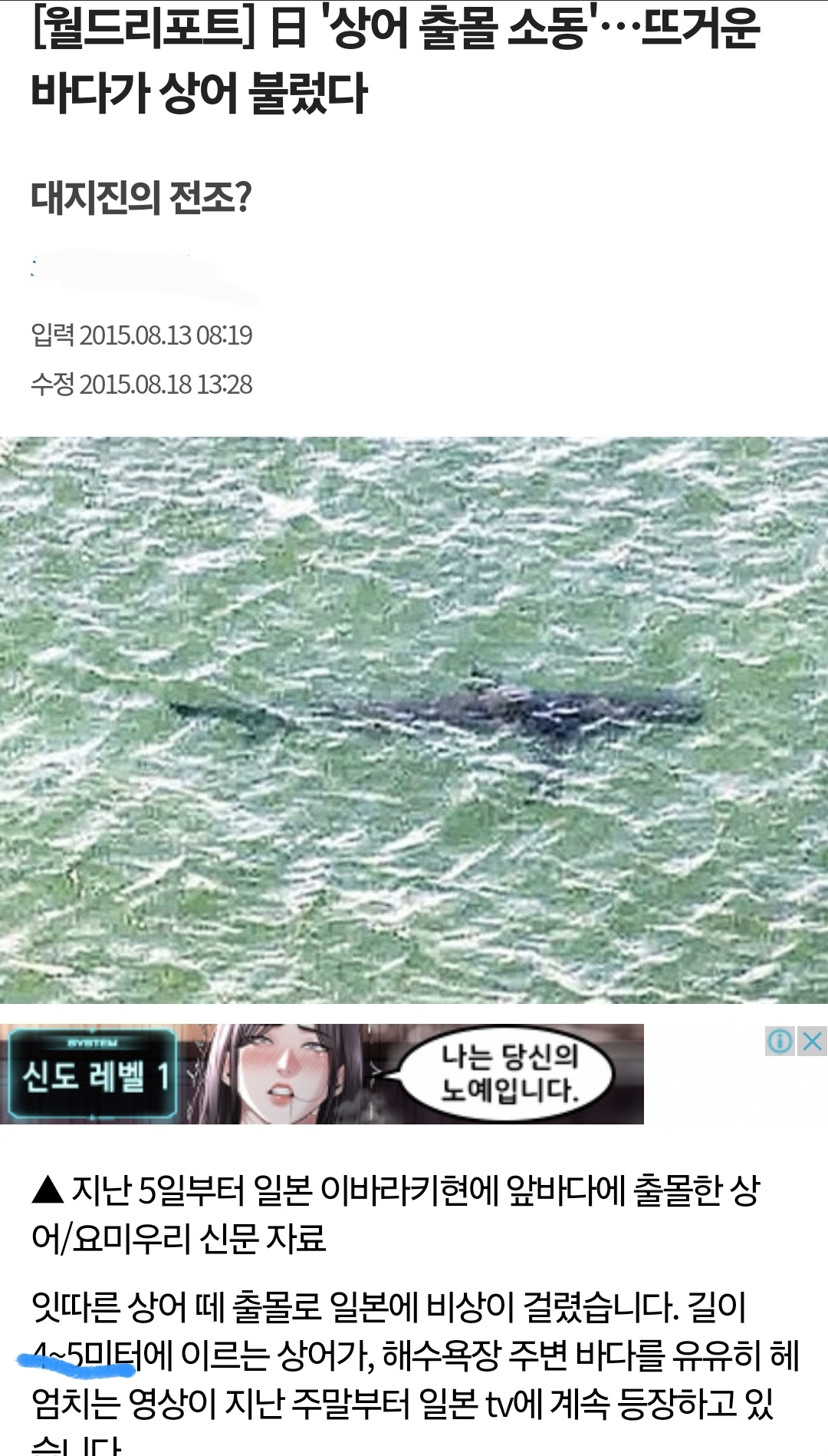 아마 우리보다 따뜻한 곳이라 더 많이 출연 할 것 같기는 함 이게 거의 10년 전 뉴스에도 나오는데 그 상어가 4~5미터 정도 하니까 | 24.06.29 18:25 | | |