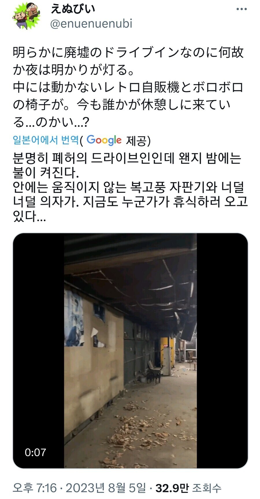 솔직히 좀 이상한게 형광등으로 보이는데 형광등이 수명이 생각보다 길지가 않음;; 더군다나 형광등 여러개 관리해보면 알지만 동일한 수명이라도 절대 똑같이 나가지 않고 수명긴놈과 짧은놈도 존재하고 수명에 따라 빛의 세기가 약해지기도 하고... 근데 저 영상의 형광등은 버려진곳이라고 하기엔 너무 쌩쌩하고 밝고 다 정상작동이라서 음...?