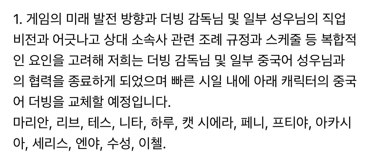 종려 성우가 미호요의 더빙 감독을 전담하고 있다고 들었음. 즉 다른 미호요 게임에도 손이 뻗쳐있다는 것. 물론 이것만으로 류웨이도 한패다!고 무작정 장담은 못하는데 류웨이가 대놓고 이 성우를 손절 때리지 않는 한 의심의 여지는 사라지지 않겠지. | 24.07.22 17:52 | | |